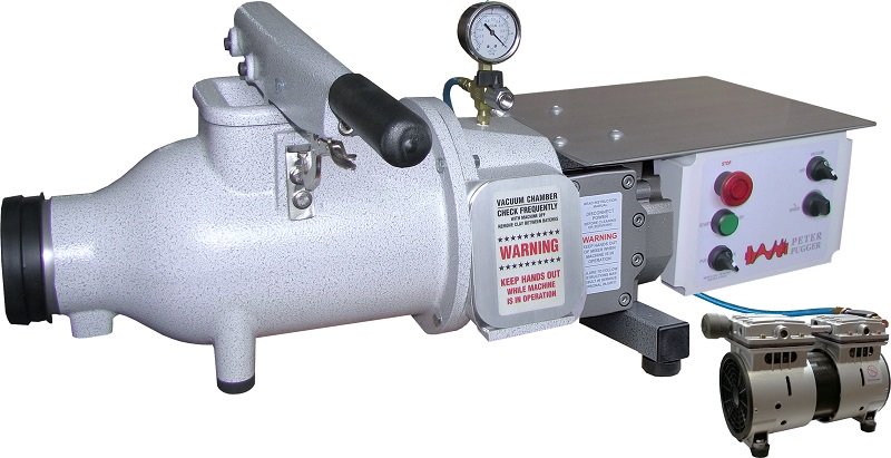 Vacuum Deaired: Each batch can be deaired by starting the vacuum pump during the last stage of mixing, leaving an air-free product when pugged out (no need to run the clay through the pugmill multiple times). Once the entire batch of clay has been deaired, switch the pugmill to PUG, and press start. Any remaining deaired clay in the machine can be stored for later use without having to remix or deair. Our patented vacuum design (Click here for full list of patents) allows us to deair the entire batch of clay without the use of cumbersome vacuum/shredding screens, or down time due to a clogged pugmill! No other mixing pugmill on the market matches the Peter Pugger’s effectiveness at deairing clay. We guarantee it!